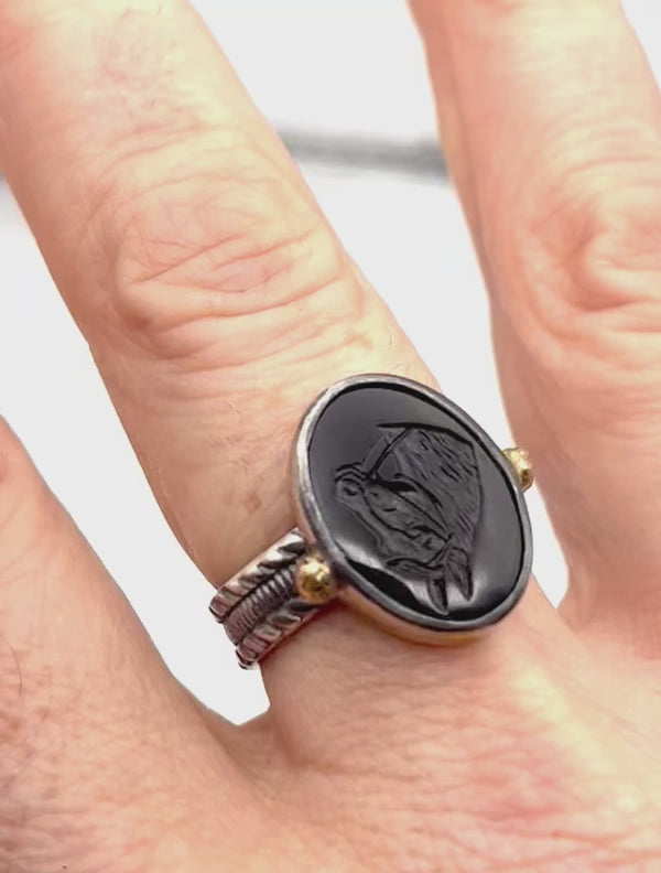 Obsidian and 14K Yellow Gold Horse Head Band – Handmade Sophisticated Jewelry, Size 8.5