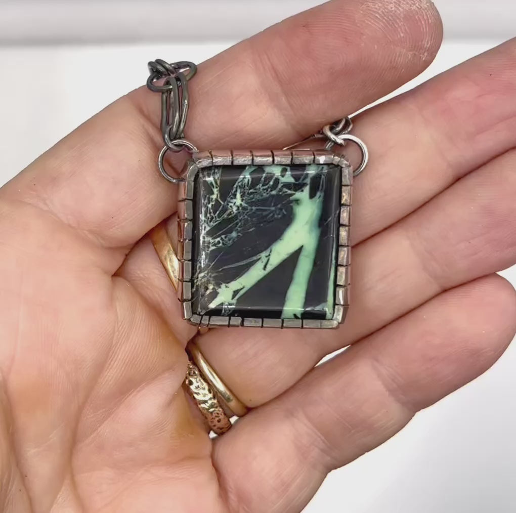 Suspended from an 18-inch handmade sterling silver chain, every link is individually formed and textured for a raw, organic elegance. This artisan necklace is perfect for lovers of sustainable fashion, fine craftsmanship, and one-of-a-kind jewelry that tells a story of transformation and timeless connection.