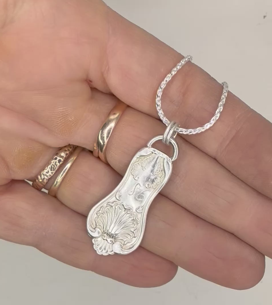 This stunning pendant features a meticulously crafted sterling silver spoon handle, repurposed and transformed into a beautiful, one-of-a-kind piece of jewelry. At the center of the pendant is a striking hexagonal-cut London Blue Topaz, its deep, rich blue hue capturing the light with every movement. The gemstone’s unique shape adds a modern touch to the vintage-inspired design, creating a perfect balance of classic and contemporary elements. The pendant hangs delicately on an 18-inch sterling silver wheat chain, known for its smooth, interwoven texture that enhances the piece's overall sophistication and wearability. A true statement piece, this pendant is perfect for those who appreciate the beauty of both fine craftsmanship and distinctive gemstones.
