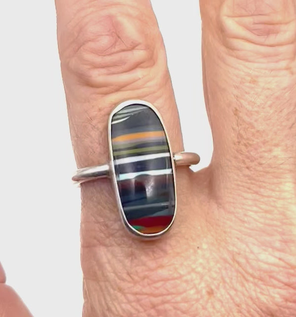 This one-of-a-kind sterling silver ring features a vibrant piece of surfite, a sustainable material made from layered resin waste collected at surfboard factories. Known for its striking color patterns and ocean-inspired aesthetic, surfite captures the energy of surf culture while supporting eco-conscious design.